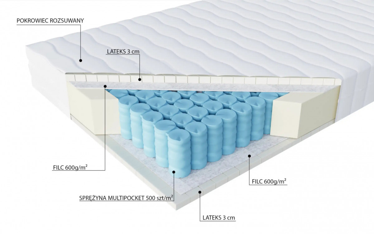 | Materace hotelowe i mieszkaniowe | Materace projektowane pod komfort snu i trwałość – różne twardości, warstwy i konstrukcje, umożliwiające dopasowanie do standardu obiektu i profilu gości. |