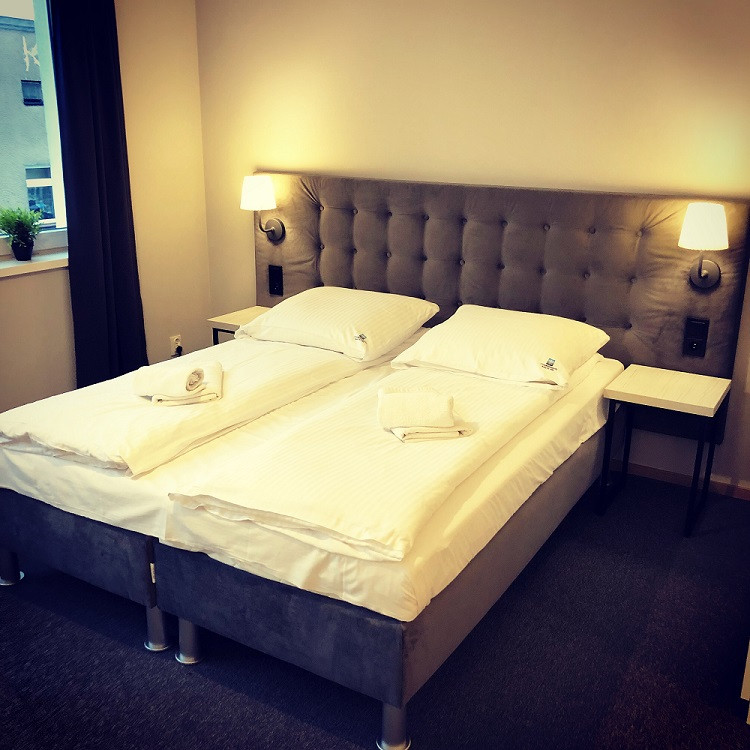 Naszą specjalnością są łóżka hotelowe kontynentalne „Comfort” wraz z materacem bonelowym dwustronnie pikowanym typ „Clasic”. Rama łóżka wykonana jest z litego drewna , na której umieszczony jest wkład bonelowy o wysokości 11cm. Warstwa wierzchnia: filc , pianka T-25 , owata. Wysokość bazy łóżka -22 cm; wysokość materaca-16 cm. Wysokość łóżka w zależności od rodzaju użytych nóg: 50-52cm. Dostępne w różnych rozmiarach. W standardzie materiałem obiciowym jest skóra ekologiczna lub welur . Wierzchnia warstwa obicia nie pozwala na przesuwanie materaca. Nogi plastikowe w kolorze czarnym lub beżowym.