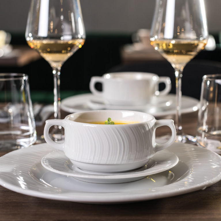 Oferta produktowa koncentruje się na elementach, które bezpośrednio budują standard serwisu w lokalu: porcelana, szkło, sztućce, tekstylia i akcesoria. Dzięki temu łatwo ujednolicić wygląd stołów oraz zaplecza obsługi na sali restauracyjnej i bankietowej.