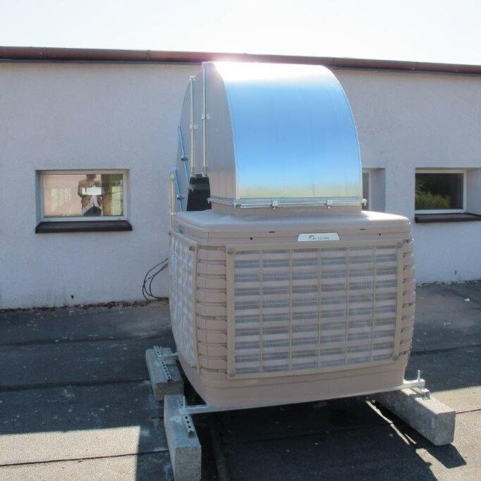 | Chłodzenie adiabatyczne – klimatyzatory ewaporacyjne | Klimatyzatory przemysłowe ewaporacyjne do szybkiego schładzania dużych powierzchni i poprawy komfortu pracy. Dostarczają świeże, schłodzone i nawilżone powietrze; w wielu obiektach stanowią podstawę wentylacji/chłodzenia hal. Rozwiązanie szczególnie użyteczne w dużych kubaturach i strefach o wysokich zyskach ciepła. |