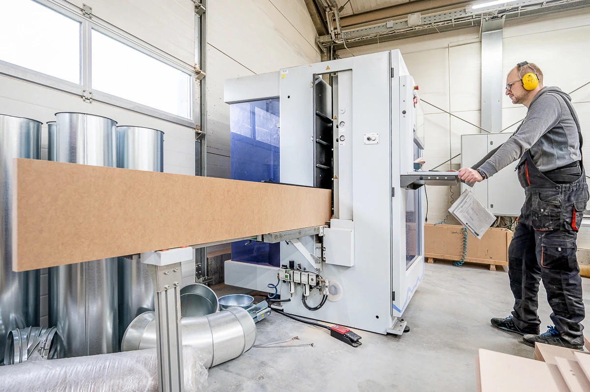 Wśród wykorzystywanych rozwiązań znajdują się m.in. 5-osiowe centrum obróbcze HOMAG, 3-osiowe centrum obróbcze SCM, centrum nestingowe SERON, pionowe centrum obróbcze CNC Weeke, maszyna CNC do wiercenia i wbijania kołków HOMAG, a także piły panelowe HOMAG i SCM oraz strugarki czterostronne WEINIG i REIGNMAC. Taki zestaw technologiczny zwiększa elastyczność realizacji i pozwala utrzymać wysoką dokładność obróbki.