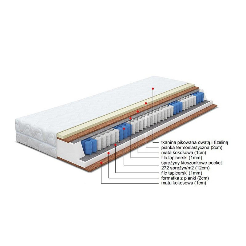 | Materace kieszeniowe | Materace sprężynowe typu kieszeniowego (pocket) – wybierane ze względu na stabilne podparcie i pracę punktową. Dostępne warianty łączone, np. kieszeniowy + kokos lub wersje ze strefami twardości. |