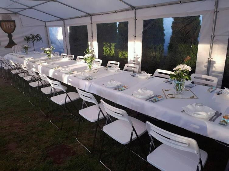 | Zestawy plastikowe, stoły i krzesła | Wyposażenie uzupełniające do organizacji strefy konsumpcyjnej i miejsc dla gości. Strona prezentuje stoły o różnych wymiarach oraz krzesła, co pozwala dopasować układ wyposażenia do charakteru wydarzenia i planowanej liczby uczestników. |
