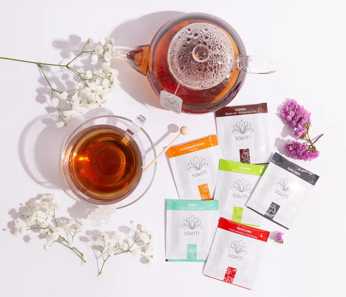 | Saviti | Klasyczna linia herbat ekspresowych dostępna w kilku smakach, przeznaczona m.in. na bufety śniadaniowe, do pokoi hotelowych i biur. Każda porcja jest pakowana osobno, co wspiera higienę, świeżość i prostotę organizacji serwisu. |