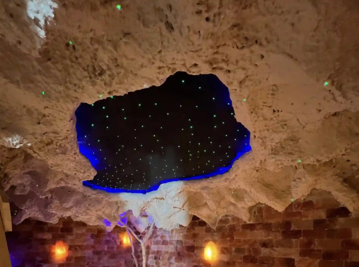 | Groty / jaskinie solne | Strefy inhalacyjne i relaksacyjne budowane z elementów solnych: cegły solne, lampy solne, podłoga z granulatu solnego oraz scenografia wnętrza (np. sufit „jaskiniowy”, światłowodowe „gwiezdne niebo”). Możliwe łączenie groty z tężnią wewnętrzną i generatorem aerozolu solnego. |