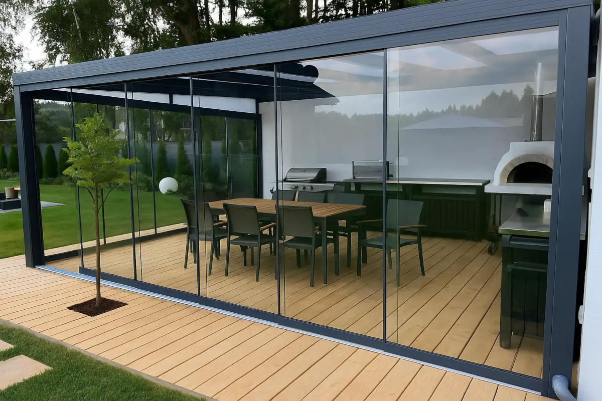 | Przeszklenia boczne | Systemy przeszkleń pozwalające częściowo lub całkowicie domknąć pergolę od boków. Rozwiązania te poprawiają komfort użytkowania przy wietrze, opadach i niższych temperaturach, a także nadają strefie tarasowej bardziej architektoniczny, uporządkowany charakter. |