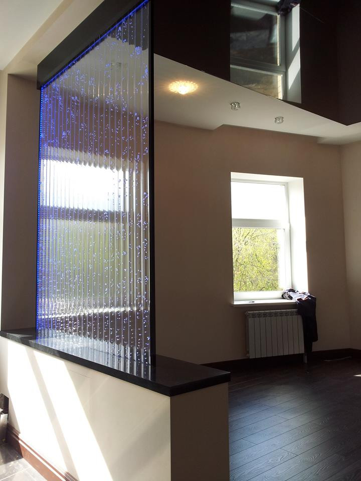 Elementy wykonane są z bezpiecznego materiału PMMA (plexi), odpornego na uszkodzenia mechaniczne. Tworzywo charakteryzuje się dużym współczynnikiem przepuszczalności światła, a po wyłączeniu napowietrzenia staje się całkowicie przejrzyste. Ściany wodne z bąbelkami wypełnione są demineralizowaną wodą, dzięki czemu nie wymagają czyszczenia od środka przez cały okres użytkowania. Dzięki zamontowanemu oświetleniu LED RGB, można uzyskać niezwykłe efekty świetlne, które zachwycą dosłownie każdego. Panele bąbelkowe charakteryzują się dużą elastycznością w zakresie rodzaju zabudowy i użytych materiałów. Tego typu dekorację można wkomponować w zwykłą ścianę lub stworzyć atrakcyjną konstrukcję, która jeszcze bardziej podkreśli indywidualny charakter danego miejsca. Dzięki użyciu specjalnej podstawy, ściana jest stabilna i może zostać wykorzystana również bez dodatkowej zabudowy, pełniąc funkcję elementu rozdzielającego strefy pomieszczenia.