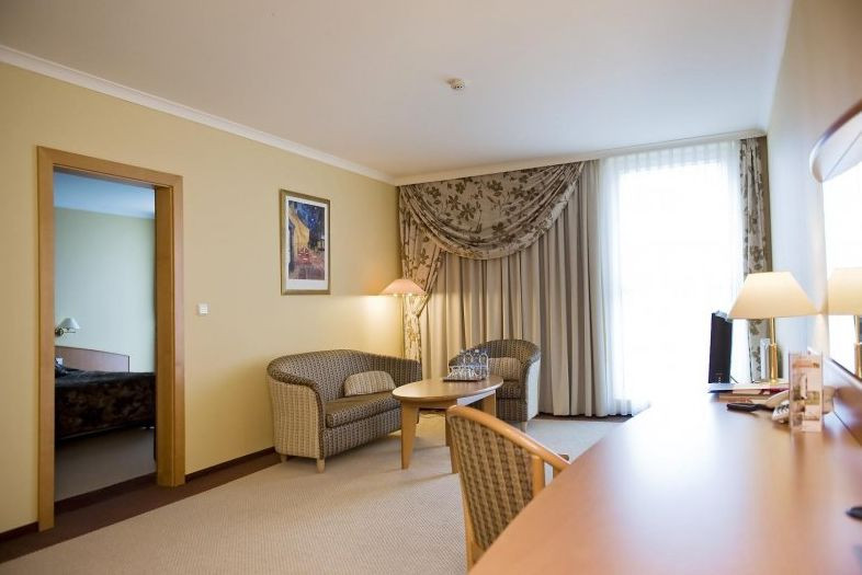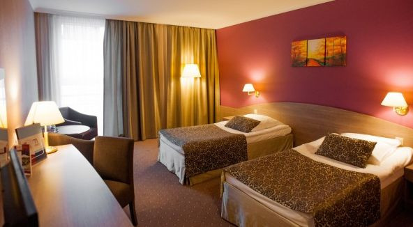 . 'Do dyspozycji naszych Gości są 123 pokoje, 2 apartamenty oraz ponad 170 miejsc parkingowych. 4-hektarowy teren przyległy do hotelu jest doskonałym miejscem do zorganizowania imprez okolicznościowych czy pikników. Do dyspozycji jest również chata grillowa mogąca pomieścić 150 osób, hala namiotowa o powierzchni 525 m2 czy też mniejsze namioty na bardziej kameralne imprezy.