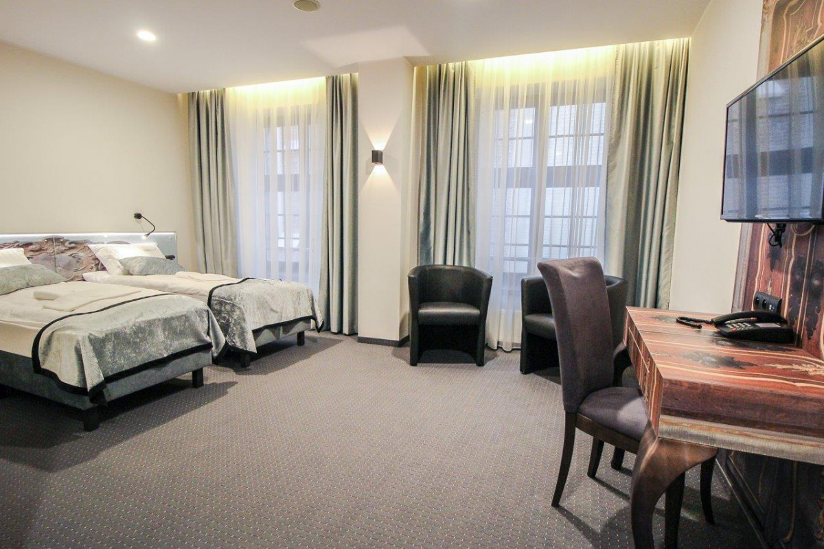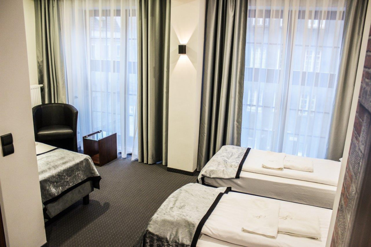 Celestin Residence posiada w ofercie również pokoje dwuosobowe typu TWIN, które zapewniają większą strefę komfortu, wygodny układ umeblowania oraz niepowtarzalne widoki na średniowieczny kościół św. Jana, który idealnie wpasowuje się w styl architektoniczny naszego obiektu. Panorama Gdańska widoczna z okna jest dodatkowym atutem. Idealny pokój dla znajomych, gości biznesowych i dla wymagających par ceniących dużą przestrzeń i swobodę. Wyciszony pokój, dwa pojedyńcze łóżka typu Twin i wysokiej jakości asortyment pościeli, pozwolą na długi i spokojny sen w miejscu, o którym trudno zapomnieć i do którego często się wraca.
