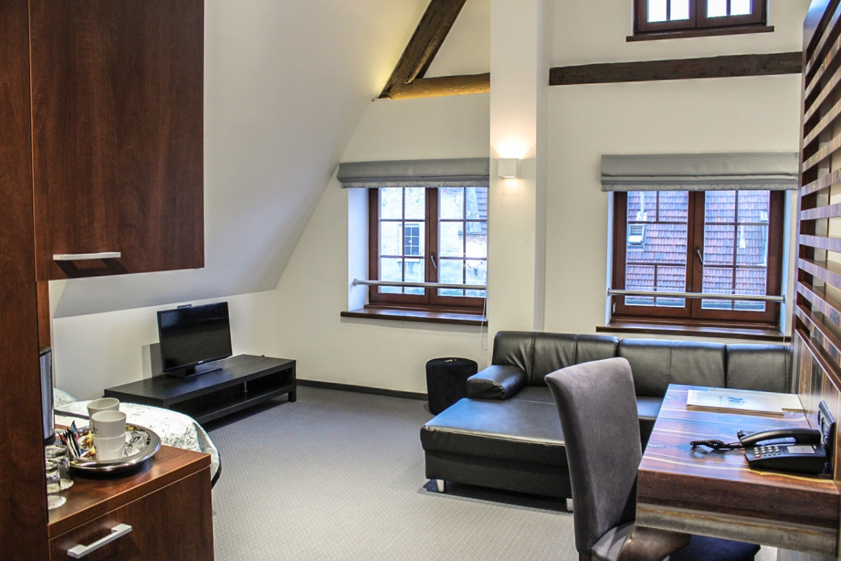 Na poddaszu Celestin Residence przygotowaliśmy dla Państwa pokój, który w pełni oddaje urok stylu w jakim stworzony został Celestin Residence. Piękny łamany sufit, przecięty oryginalnymi stropami z widokiem na horyzont gdańskiej starówki dopełnia okno skierowane w stronę średniowiecznego kościoła św. Jana. Przytulna łazienka zapewni widok, który zapiera dech w piersiach. Pokój jest klimatyzowany, co w połączeniu z uchylnym oknem zapewni strefę komfortu w upalne dni. Symbol drzwi gdańskich klejonych do ściany i otoczonych stylowym biurkiem, przeniesie Państwa w czasy, kiedy na ulicach Starego Miasta tętniło życie średniowiecznego czaru.
