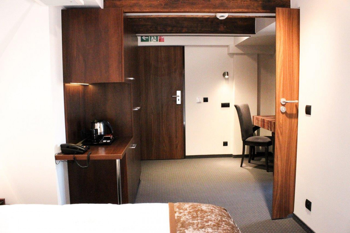 Pokój z dużym podwójnym łóżkiem 140/200 cm usytuowany przy dużym oknie z roletą z widokiem na zabudowania starego miasta. Jest to jedyny pokój w Celestin Residence z aneksem kuchennym, w którym można swobodnie przygotować posiłek, wygodnie zaparzyć smaczną kawę, herbatę lub pocieszyć się czymś chłodnym prosto z lodówki. Liczne półki zapewniają przestrzeń na prywatne rzeczy. Szklane drzwi do kuchni i łazienki dodają uroku całemu wyposażeniu. Modna łazienka z stylową umywalką.