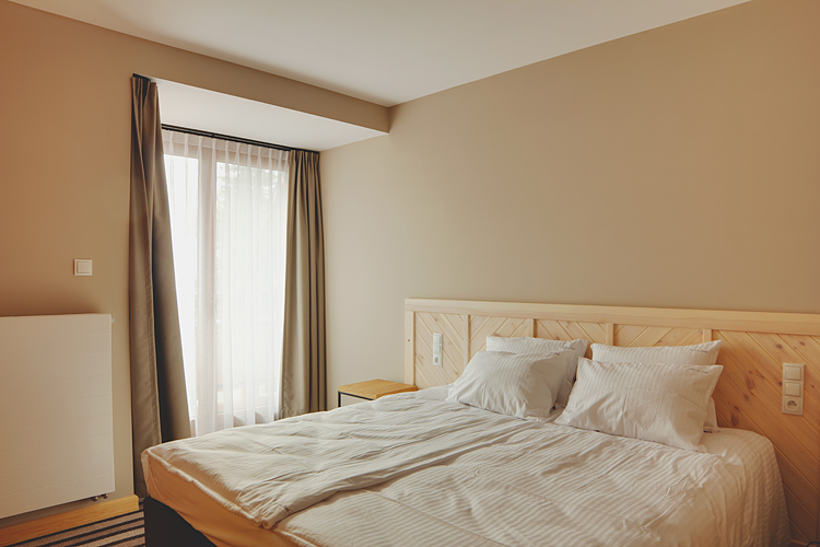 W wnętrzach hotelowych oprócz szyku i elegancji dekoracja okna musi zaciemniać i tłumić hałas. W tym celu stosujemy odpowiednie tkaniny: DIM OUT (tkanina z tzw czarną osnową) lub BLAC OUT (tkanina dająca 100% zaciemnienia) . W zawieszaniu firan i zasłon stawiamy na szybkie i łatwe w obsłudze rozwiązania.