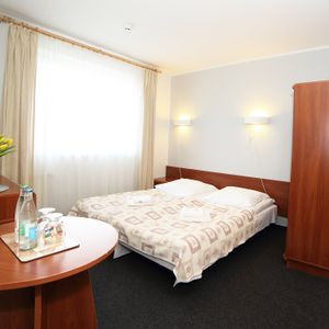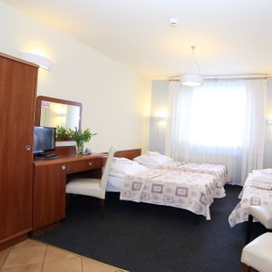 . 'Hotel posiada 43 wygodne pokoje 1,2,3 osobowe apartamenty i studia. Wszystkie pokoje wyposażone są w łazienkę, telefon, internet wifi lub przewodowy, powitalną wodę mineralną Staropolanka. 2 pokoje przystosowane są dla osób niepełnosprawnych. Wszystkie pokoje mają taki sam charakter, wyposażone są w łazienkę, szafę, biurko, lustra, wygodne łóżka pojedyncze oraz łoża małżenskie. W każdej łazience znajduje się kabina prysznicowa, toaleta, przybory kosmetyczne (żel pod prysznic, szampon, mydło).