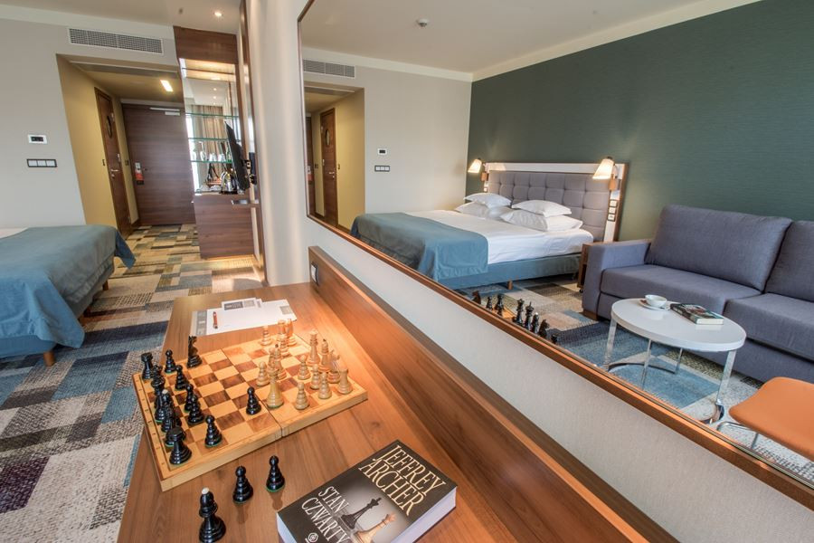 . 'Hotel dysponuje 200 komfortowymi pokojami dwuosobowymi w tym: pokoje standard (w klasycznej aranżacji, powierzchnia 30 m2, łazienka z kabiną prysznicową ok. 5 m2), pokojami superior (w nowoczesnej aranżacji, powierzchnia 30 m2, łazienka z kabiną prysznicową ok. 5 m2), pokojami typu studio w klasycznej aranżacji, które można łączyć dzięki wewnętrznym drzwiom (polecane dla rodzin z dziećmi), pokojami dla osób z dużą wrażliwością alergiczną i dla osób niepełnosprawnych (w klasycznej aranżacji).