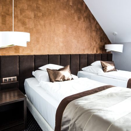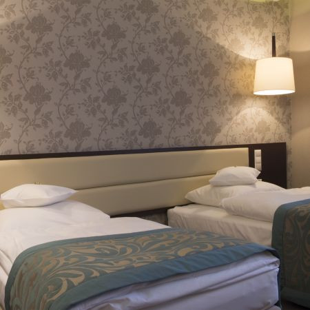 Przestronny dwuosobowy pokój o powierzchni 25 m², z łazienką z bezbrodzikową kabiną prysznicową. Wystrój wnętrz pokoju kąpielowego z naturalnego kamienia. Na wyposażeniu pokoju znajdują się telewizory LCD, Światłowodowy Internet bezprzewodowy (WI-FI), telefon, radio, obszerna szafa z miejscem na bagaż. Część pokoi dysponuje sejfami, minibarami i obszernymi balkonami. Każdy gość otrzymuje na czas pobytu płaszcz kąpielowy SPA, w celu ułatwienia komfortowego korzystania ze strefy wellness. Nasze markowe łożka hotelowe Simonshospitality , pozwalają – w razie potrzeby- błyskawicznie przekształcać się w jednoczęściowe łoża małżeńskie ( z jednolitym materacem 1,80 na 2 m).