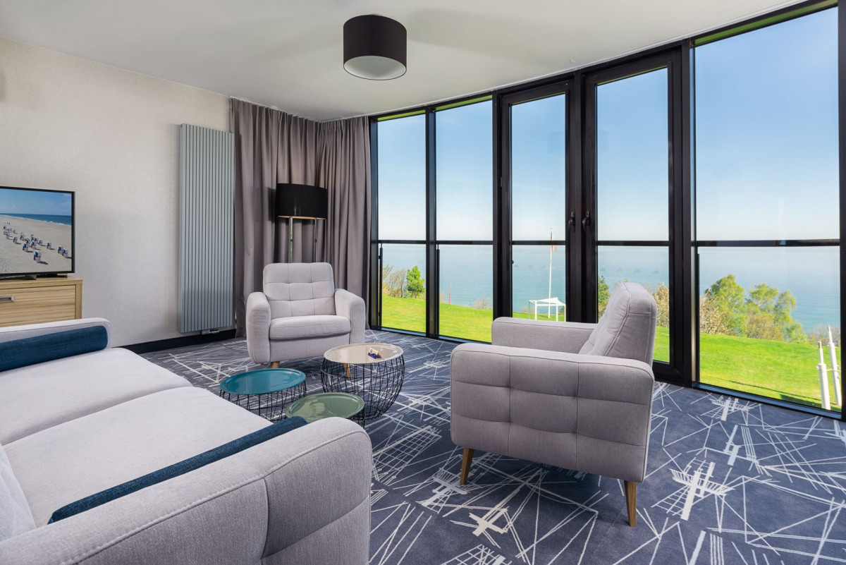 - Apartament Admiralski – przestronny apartament znajduje się na II piętrze. Z pokoju dziennego jak i sypialni wyłania się panorama Morza Bałtyckiego. Apartament posiada przeszkloną ścianę, która pozwala na obserwowanie bezkresu wód. Apartament wyposażony jest w 2 telewizory (*), lodówkę z mini barem, żelazko i deskę do prasowania, czajnik bezprzewodowy z zapasem herbaty i kawy, telefon, lornetkę/lunetę oraz sejf. W łazience znajduje się prysznic, zestaw kosmetyków, ręczniki, szlafroki, suszarka do włosów
