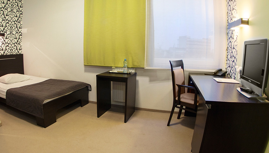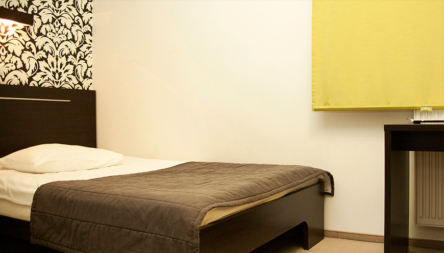 Nowocześnie stylizowany i funkcjonalny pokój dwuosobowy. Zapewnia komfort do pracy i wypoczynku.