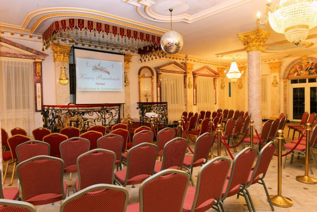 Sala Książęca. Główna sala Hotelu Książę Poniatowski, o powierzchni 240 m2, pełniąca także funkcję restauracji i baru. W formie zasiadanej pomieści do 210 osób, z miejscem do zabawy tanecznej - do 120 osób. Salę Książęcą można połączyć z Salą Balową i zorganizować bankiet z parkietem tanecznym nawet do 250 osób.