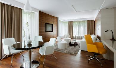 Wszystkie Apartamenty są w pełni klimatyzowane oraz posiadają telewizor LCD z radiem, bezprzewodowy internet, wbudowany sejf, biurko do pracy, telefon, kanapę, dwa fotele i stolik kawowy. Mini-bar może zostać uzupełniony na życzenie i za opłatą.