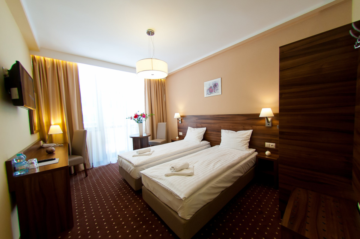 Wszystkie pokoje Studio Hotelu *** PODIUM wyposażone są w oddzielne łóżka, obszerne tarasy, łazienkę z prysznicem, toaletę, telefon, telewizor z szerokim wyborem kanałów, miejsce do pracy.
