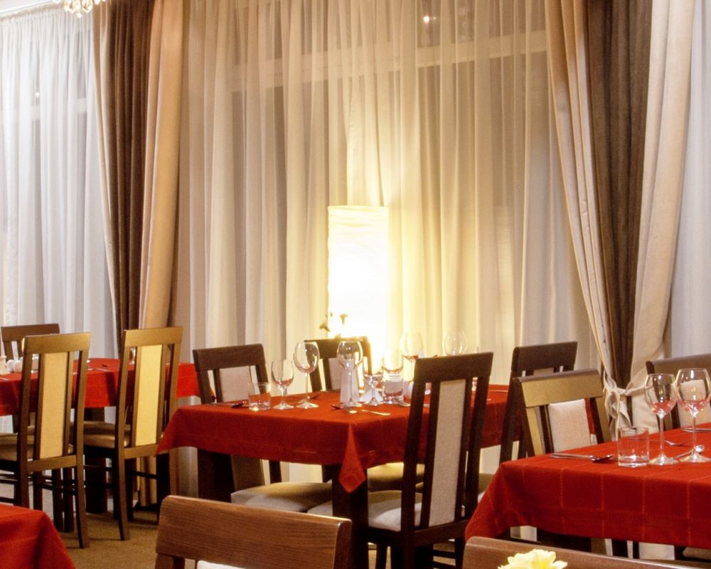 . 'Wszystkim odwiedzającym nas Gościom polecamy wizytę w hotelowej restauracji, w której serwujemy przepyszne dania zarówno kuchni polskiej, jak i europejskiej. W naszej restauracji pracują wspaniali kucharze, których dania z pewnością zaspokoją gusta największych smakoszy. Oferujemy śniadania podawane w formie bufetu szwedzkiego. Zajmujemy się także organizacją przyjęć okolicznościowych, weselnych i biznesowych.