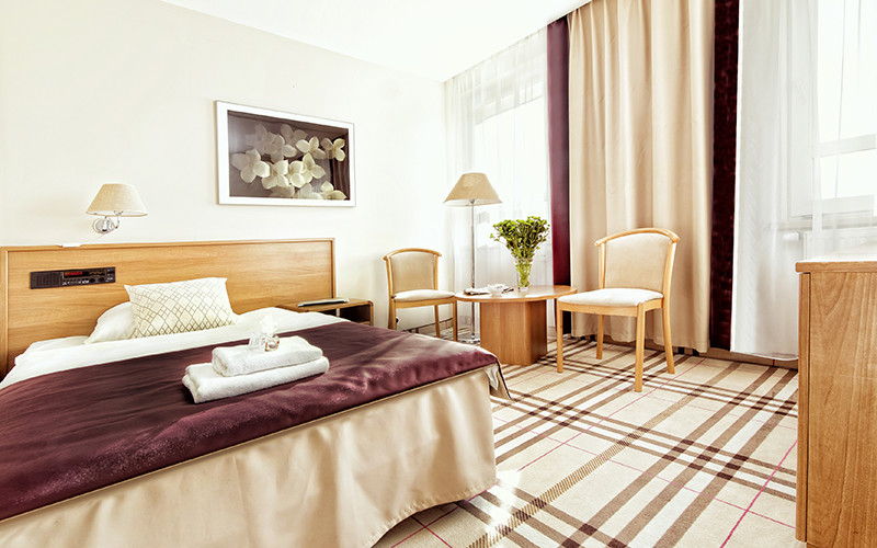 Pokój z wyjątkowo eleganckim designem, doskonale wyposażona łazienka z dużą narożną wanną. Połączenie strefy sypialnej z przestrzenią dzienną umożliwia relaks nawet podczas wykonywania obowiązków służbowych. W wyposażeniu pokoju: duża łazienka z wanną, telewizja z kanałami polskimi i obcojęzycznymi, telefon, radio, stały dostęp do internetu, stolik okolicznościowy, mini-lodówka.