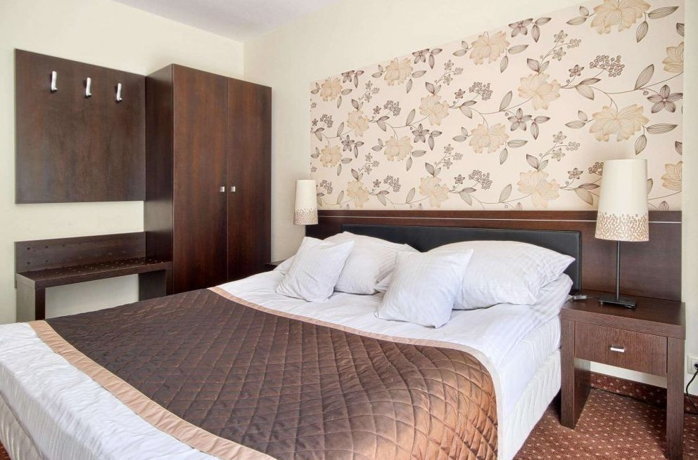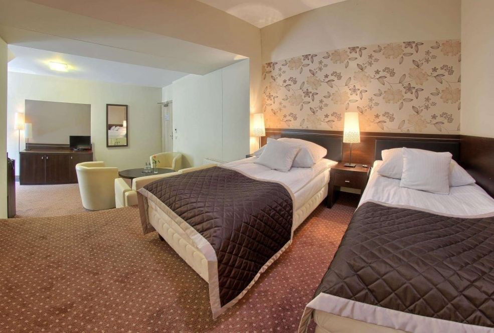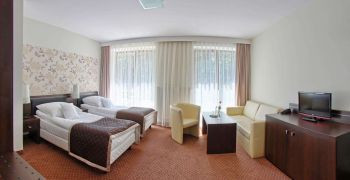 . 'Obiekt spełnia standardy hotelu trzygwiazdkowego oraz oferuje 75 miejsc noclegowych w pokojach jedno i dwuosobowych oraz apartamentach w ogrodzie. Wszystkie pokoje są komfortowe i przestronne, urządzone gustownie i funkcjonalnie. Do dyspozycji gości oddajemy klimatyzowaną salę bankietową, która zapewnie komfortowe warunki nawet przy 100-osobowych imprezach oraz sale konferencyjne o maksymalnej pojemności do 150 uczestników. Gwarantujemy wysoki standard i indywidualne podejście do każdego klienta.