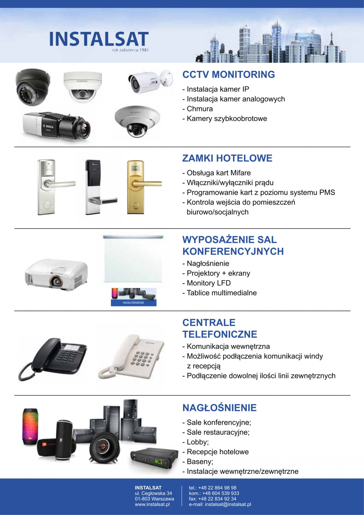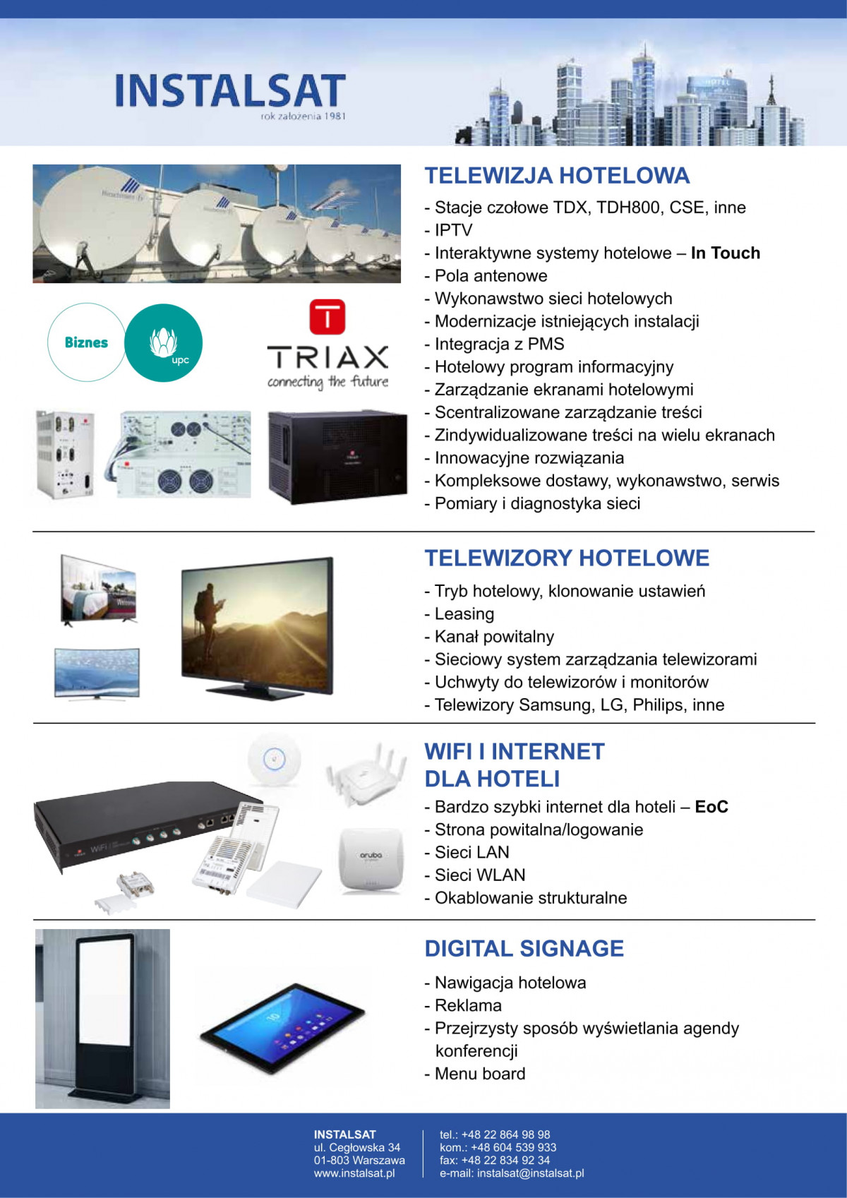 Firma INSTALSAT istnieje i działa nieprzerwanie od 1981 roku. Jest jednym z pionierów branży TV SAT w Polsce. Podstawową działalnością firmy jest kompleksowe wykonawstwo systemów teletechnicznych, ze szczególnym uwzględnieniem zbiorczych instalacji telewizyjnych TV SAT, na obiektach wszelkiego typu oraz hurtowa i detaliczna sprzedaż sprzętu TV SAT. Prowadzimy sprzedaż wysyłkową, zaopatrujemy hurtownie, firmy handlowe i instalatorskie. Oferujemy sprzęt większości głównych producentów będących na rynku europejskim, ze szczególnym uwzględnieniem sprzętu renomowanych marek TRIAX, HIRSCHMANN, ENGEL, GRUNDIG, TRANSMEDIA, SATRIX - ponad 12000 wyrobów.