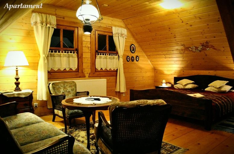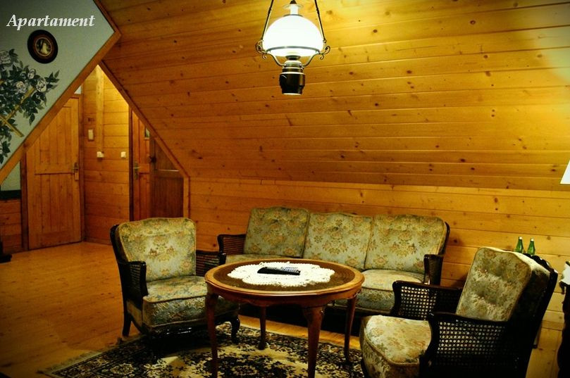 Zapraszamy również do wypoczynku w naszym domku znajdującym się w sąsiedztwie Karczmy. Do dyspozycji naszych Gości oddajemy sympatyczny drewniany domek położony na 9-arowej ogrodzonej działce z miejscem na ognisko i krytym tarasem – idealnym miejscem do grillowania. W trzech sypialniach oferujemy Państwu 6 miejsc noclegowych z możliwością 3 dostawek. Jedna z sypialni wyposażona jest w balkon, z którego podziwiać można przepiękne widoki okolicznych gór i lasów. W domku znajduje się także duży salon z kominkiem oraz TVsat połączony z w pełni wyposażonym aneksem kuchennym. Do dyspozycji Gości jest również łazienka z kabiną prysznicową oraz toaleta.