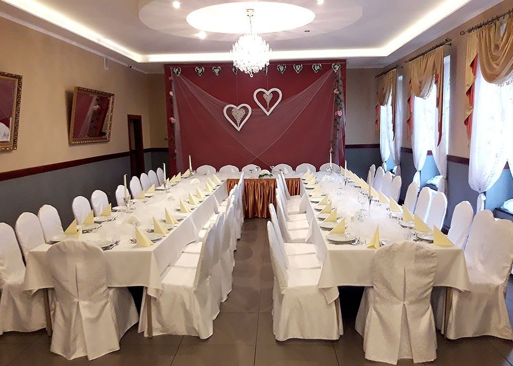 Sala weselna pomieści ponad 100 os. jest klimatyzowana i posiada bogaty wystrój. Podczas przyjęcia weselnego szef kuchni zaserwuje pyszny obiad, smaczne zakąski oraz dodatkowe niespodzianki kulinarne. Nasza kadra animatorów zajmie się dziećmi i poprowadzi dla wszystkich zabawy oraz tańce animacyjne. Profesjonalna obsługa kelnerska zadba o każdy szczegół, by goście poczuli się wyjątkowo. O wyjątkowy wystrój sali, odpowiedni dobór muzyki oraz dodatkowe atrakcje zadba nasza kadra, uwzględniając wszelkie życzenia i sugestie. Waszym jedynym zadaniem będzie się dobrze bawić i pięknie wyglądać. Dla wszystkich gości udostępnimy pokoje, zaś w sali jadalnej zaserwujemy bufet śniadaniowy.