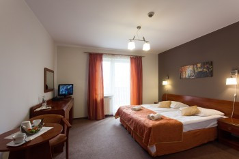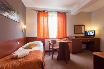 Na wyposażenie łazienki składa się prysznic o wymiarach 90x90, suszarka do włosów, mydło w pianie, żel pod prysznic oraz dwa ręczniki. Pokoje 1-osobowe to pokoje bez balkonów. Cena noclegu obejmuje śniadanie wydawane w godzinach od 8:00 do 10:00, możliwość korzystania ze strefy SPA, opłatę klimatyczną, podatek VAT, monitorowany, niestrzeżony parking, Internet Wi-Fi.