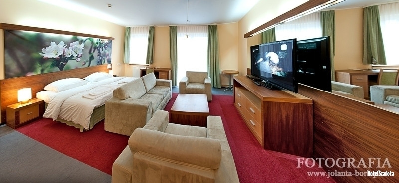 Pokój o powierzchni 30 m2. Na wyposażeniu pokoju dwa pojedyncze komfortowe łóżka z możliwością łączenia do łoża małżeńskiego, obszerną szafę, biurko z krzesłem, wygodną kanapę, dwa fotele, stół, telefon, dostęp do internetu (kablowy i WIFI – gratis), łazienkę z wc, prysznicem, umywalką, bidetem, suszarką.