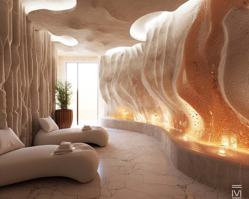 Nieregularnie powyginany sufit, który imituje sklepienie jaskiniowe, oraz podświetlane aplikacje solne, dodają grocie solnej wyjątkowego charakteru, przypominając o naturalnych formach i kształtach, jakie można znaleźć w prawdziwych kopalniach soli. Beczki drewniane z lampami solnymi nie tylko są elementem dekoracyjnym, ale również źródłem dodatkowego światła i jonów ujemnych, wzmacniając terapeutyczny wpływ groty na zdrowie i samopoczucie.