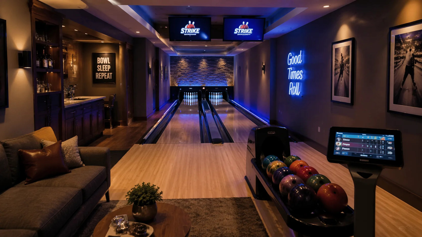 pełnowymiarowy tor z podstawową automatyką, pinsetterem, systemem zwrotu kul i scoringiem, przygotowany jako prywatna instalacja domowa.