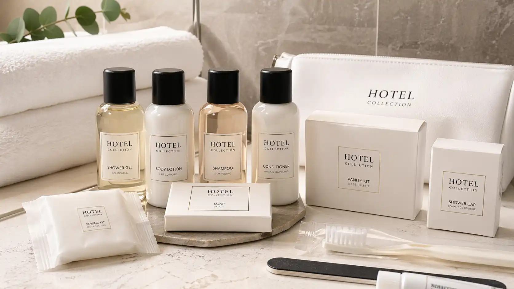 podstawowe mydełko hotelowe 10–20 g, jeden kosmetyk typu szampon / żel / 2w1 oraz prostą galanterię higieniczną.