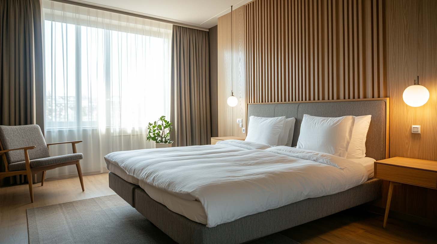 Meble tapicerowane – takie jak zagłówki łóżek, krzesła czy sofy – wraz z zasłonami pomagają wytłumić hałas i zmniejszają pogłos. Dzięki temu goście odczuwają wyższy komfort snu i odpoczynku.
