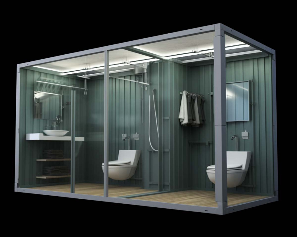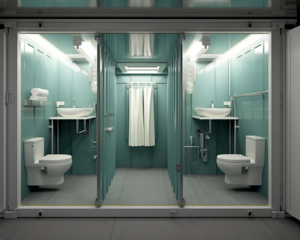 Zakres wyposażenia - Im więcej kabin prysznicowych, umywalek i toalet, tym wyższy koszt. Dodatkowo cena rośnie, jeśli kontener zawiera szatnię, strefy damsko-męskie, osobne wejścia, magazynki lub przestrzeń dla obsługi technicznej.