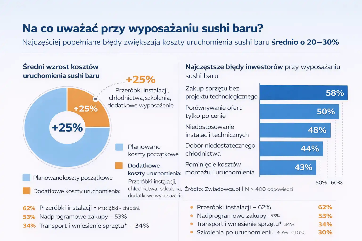 W trakcie realizacji prawie zawsze pojawiają się drobne zmiany: dodatkowe półki, akcesoria, korekty ustawienia sprzętu czy doposażenie stanowiska sushi. Brak zapasu finansowego utrudnia szybkie rozwiązanie tych problemów. |