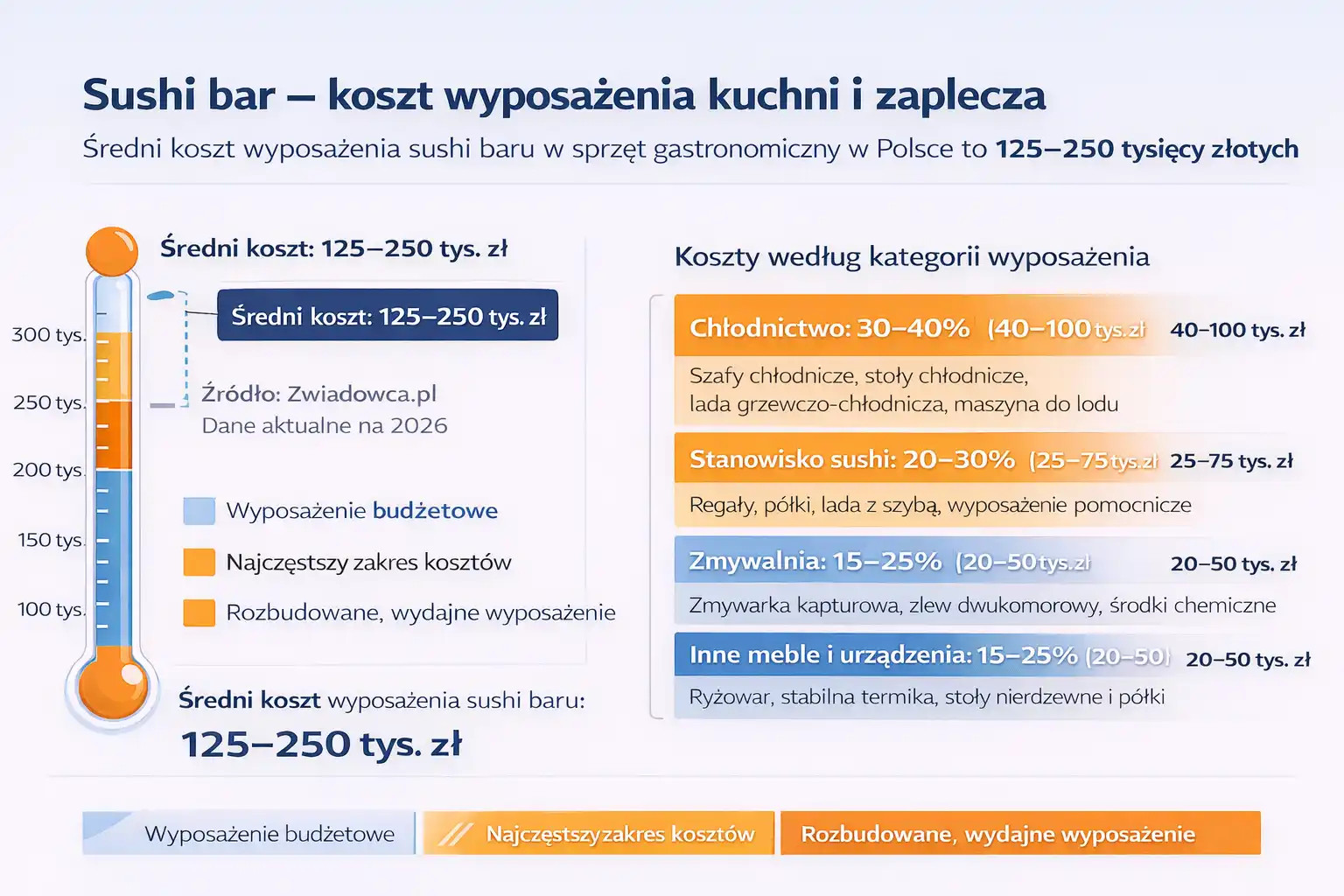 Budżet na przygotowanie kuchni i zaplecza w sushi barze zależy przede wszystkim od organizacji stanowiska sushi, jakości i skali chłodnictwa, a także od tego, czy lokal ma obsługiwać głównie gości na miejscu, zamówienia na wynos czy również delivery. Największe różnice w ofertach robią zwykle: lada sushi i strefa przygotowania ryb, szafy oraz stoły chłodnicze i meble technologiczne ze stali nierdzewnej.