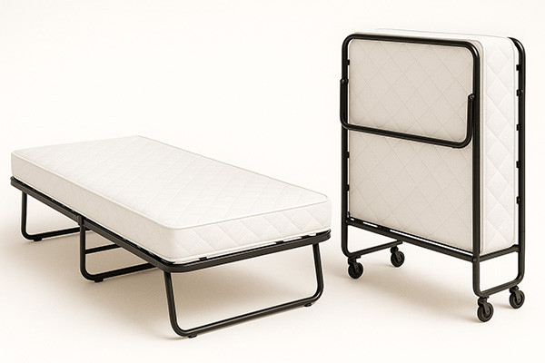 | Łóżko dostawne składane (rollaway) | Lekka konstrukcja z ramy stalowej lub aluminiowej na kółkach, składana pionowo. Materace cienkie piankowe lub sprężynowe (8–12 cm), mocowane pasami. Plus: łatwe rozstawienie i przechowywanie, minus: niższy komfort. Stosowane jako dodatkowe spanie, rzadko jako główne łóżko. |