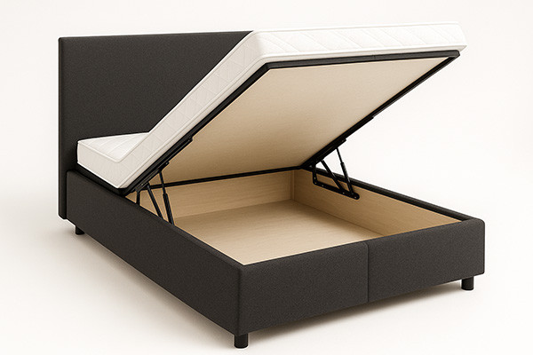 | Łóżko z pojemnikiem na pościel | Konstrukcja z ramą skrzyniową i mechanizmem podnoszenia (podnośniki gazowe lub sprężynowe). Po uniesieniu stelaża i materaca dostępna jest komora na pościel i tekstylia. Plus: oszczędność miejsca i dodatkowa przestrzeń magazynowa. Wymaga jednak 80–100 cm wolnej przestrzeni z przodu. Minusy: ciężar, wolniejszy serwis, ryzyko awarii podnośników. Skrzynia z MDF/laminatów, często tapicerowana. Wymaga wentylacji dna. |