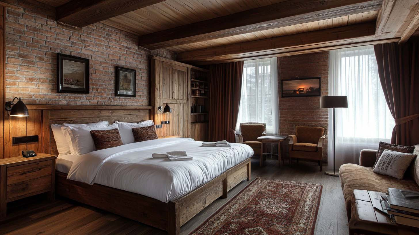 | Uniwersalność – pasuje do hoteli klasycznych, butikowych, górskich i nowoczesnych | Podatność na warunki – drewno reaguje na wilgoć i zmiany temperatury (pracuje, może pękać) |