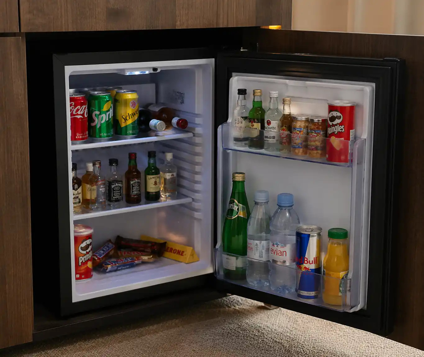 markowy minibar o wyższym standardzie, często cichszy, lepiej wykończony, z większym naciskiem na estetykę i wygodę gościa.