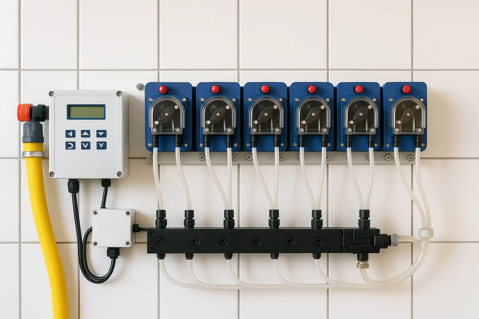 • 6–8 pomp, często z podwójnym dozowaniem • Systemy z kontrolą higieny i precyzyjnym płukaniem • Zgodność z normami NFPA, HACCP, normami szpitalnymi • Dodatkowe czujniki i monitorowanie zużycia detergentów |