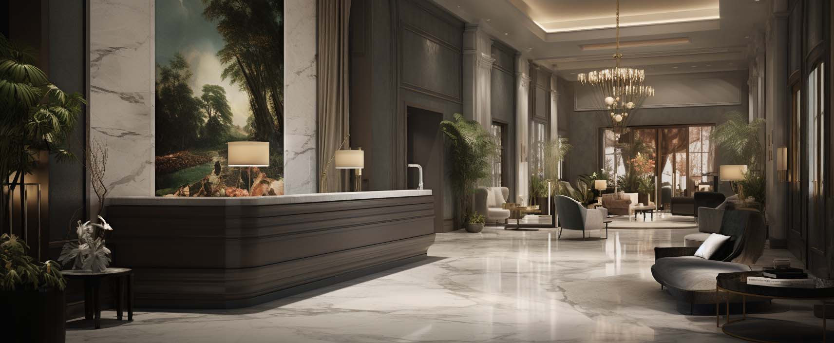 | Wyposażenie stref wspólnych | Meble w holu, dekoracje, biurko recepcyjne, oznaczenia i tablice informacyjne, rośliny ozdobne, fontanny, kioski z prasą |