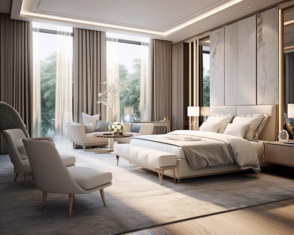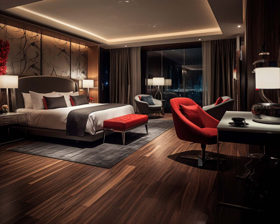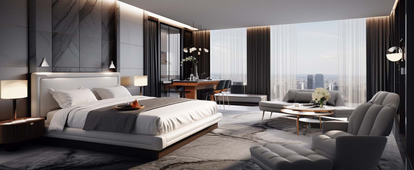 Zasłony w odcieniach szarości, beżu i czerni dodają elegancji każdemu wnętrzu hotelowemu, szczególnie gdy wybierzemy długie modele, które delikatnie opadają ku podłodze. Ich stonowane barwy sprawiają, że świetnie komponują się w minimalistycznych aranżacjach, gdzie przestrzeń dominuje nad kolorem, co dodatkowo podkreśla szykowny charakter pokoju. Ważne jest jednak, aby unikać zbyt dużego dopasowania kolorystycznego zasłon do odcienia ścian, gdyż może to spowodować, że pokój stanie się monotonny i pozbawiony wyraźnego stylu. Zamiast tego, dobierając zasłony o ton ciemniejszy niż farba na ścianach oraz inne dekoracje, można osiągnąć efektowny kontrast. Czerń, choć może być ryzykownym wyborem, w dużych, dobrze oświetlonych przestrzeniach hotelowych może prezentować się niezwykle efektownie, dodając głębi i charakteru aranżacji.