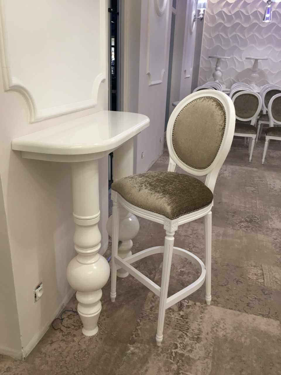 Stylowy hoker tapicerowany Ludwik XVI, dopasowany wysokością do wyspy kuchennej lub baru.
