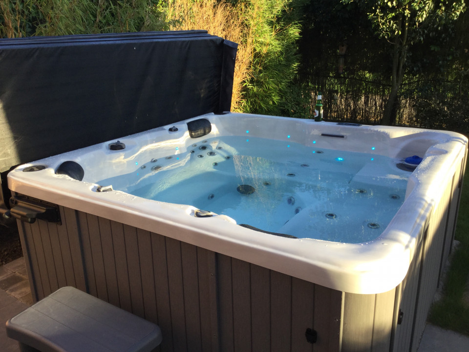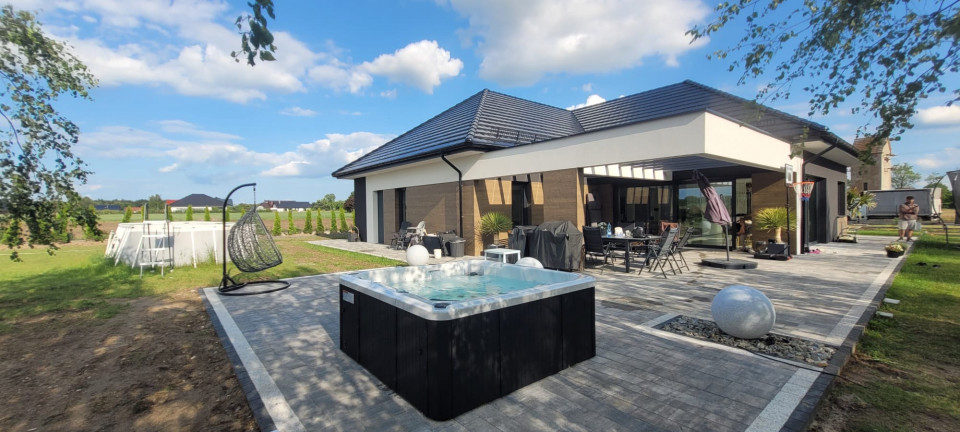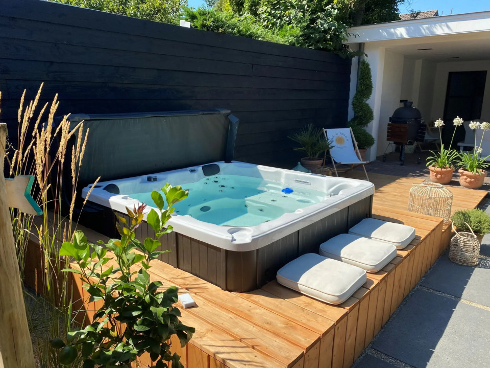 To nowoczesne jacuzzi stworzone do komfortowego relaksu w ogrodzie lub domowej strefie wellness.