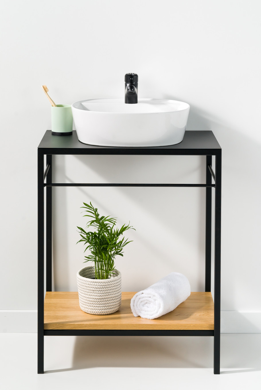 Delikatna wizualnie, nowoczesna, minimalistyczna szafka do łazienki w stylu skandynawskim, loftowym, minimalistycznym. To piękny i praktyczny element wystroju wnętrza, który upodabnia łazienkę do eleganckiego pokoju kąpielowego. Niewielkich rozmiarów półka umiejscowiona poniżej górnego blatu pozwala na przechowywanie mniej lub bardziej potrzebnych drobiazgów lub ręczników. Nowoczesna szafka pod umywalkę wykonana została z metalu oraz drewna dębowego. Posiada funkcjonalny uchwyt na ręczniki. W cenie konsoli pod umywalkę zawarte jest wycięcie otworu pod umywalkę, średnica i usytuowanie otworu do ustalenie przy realizacji zamówienia. Meble ręcznie robione, doskonałe do nowoczesnych wnętrz. Modele dla projektantów w zakładce: https://decosteel.pl/do-pobrania/