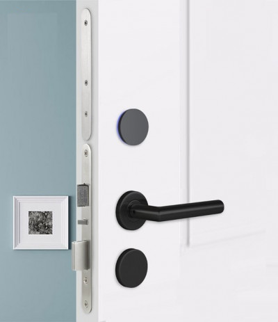 Klamka w standardowym trybie pracy pozostaje zablokowana, a dopiero w momencie autoryzacji karty na czytniku następuje możliwość otwarcia drzwi.